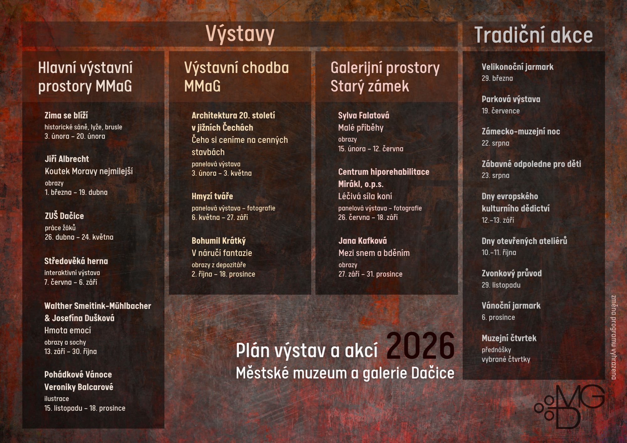Připravili jsme si toho pro vás ale mnohem více a všechny akce naleznete níže přehledném kalendáři akcí pro rok 2026. Pro aktuální informace nás však nezapomeňte sledovat na našich webových stránkách a na facebooku a instagramu.